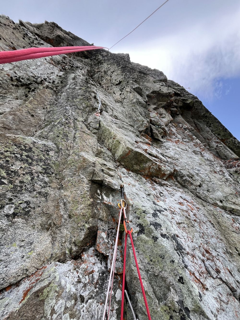 Další délky docela šly, resp. lépe, než jsem čekal. Na druhou stranu podmínky byly zase horší, než jsem čekal. Mělo foukat 6-22 m/s, což je samozřejmě dost, ale od JZ. Buzolu jsem neměl, abych ověřil, zda jsem opravdu v severní stěně. No nic. Šel jsem stejně do cesty spíše otestovat, zda by šla sólo volně a zda bivak je v pohodě.