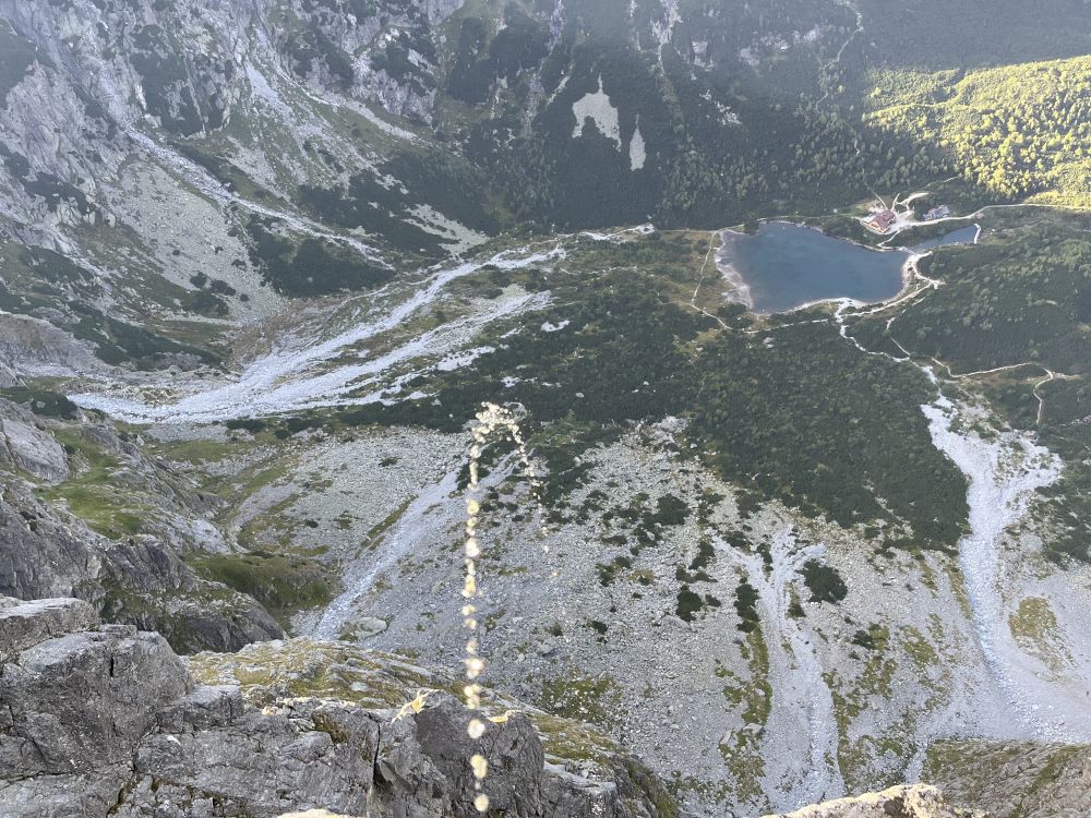 Střih. 28. 8. ráno nastupuju do Superdiretissimy sám, tedy úplně sám nejsem. Je se mnou svině a pěkně těžká – 4 litry vody, 2 lana (singl a půlka), friendy, vklíněnce, expresky, karabiny, blokanty, teplé oblečení, spacák, karimatka, vaření a jídlo. Cesta je na tatranské poměry dlouhá, má 13 délek plus dolez na vrchol Pavúkove veže. Při jištěném sólu je navíc potřeba každou délku vylézt, zafixovat lano na štandu, při slaňování vybírat některé jištění a některé nechat a refixovat na nich loďákem lano, aby při následném žumarování se neprodřel oplet, resp. refixování je nutné také pro diagonální a traverzové délky. Po slanění na původní štand se zruší a žumaruje s tahačákem zpátky nahoru.