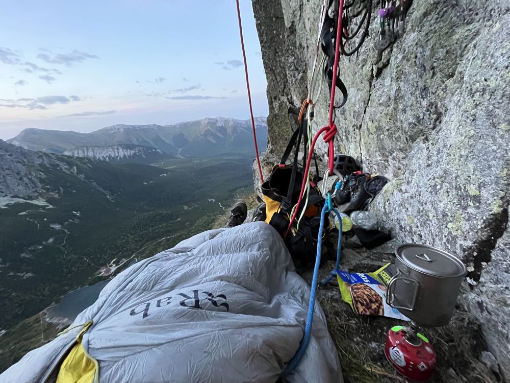 Takže pokračuji ve svém větrném tunelu. Pod sedmou délkou, kde je šikmá police, dorazím brzo, takže nechávám svini napást na kousku tatranské trávy a lezu dál. Vylezu a zafixuji si další dvě délky. Pak romantika na nafukovací skluzavce v noci, jelikož police je sice dobrá, ale ubíhá ve dvou směrech. Kromě jištěného spaní v sedáku si proto dělám i smyčku na nohy.