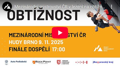 Mistrovství České republiky v lezení na obtížnost pokračuje dnes od včerejška v Brně finálovými koly. Akce se odpoledne vysílá živě na Youtube.