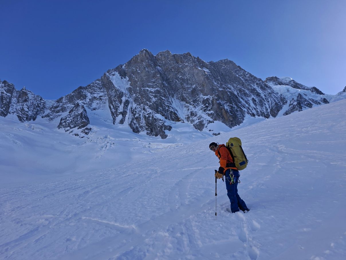 V plánu bylo dojít úplně pod nástup, ale asi 300 metrů pod ním se začíná stmívat. Dáváme tedy první bivak tady. Alespoň bude sníh ráno ztuhlý a nebude se bořit. To jsme se ale dost spletli – ráno se boříme ještě víc, i když teploty jsou někde kolem mínus 15 °C. Navíc v brzké ranní tmě nevíme kudy kam a bloudíme mezi trhlinami. Na nástupu jsme tedy pěkně pozdě a o průstupu stěnou za jeden den si můžeme nechat jen zdát.
