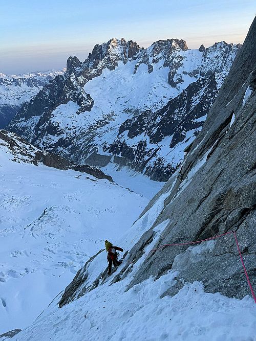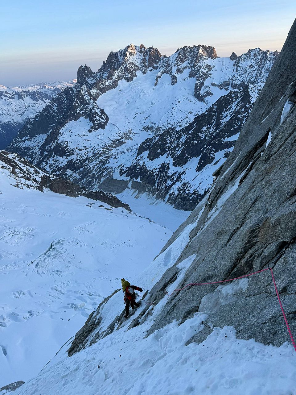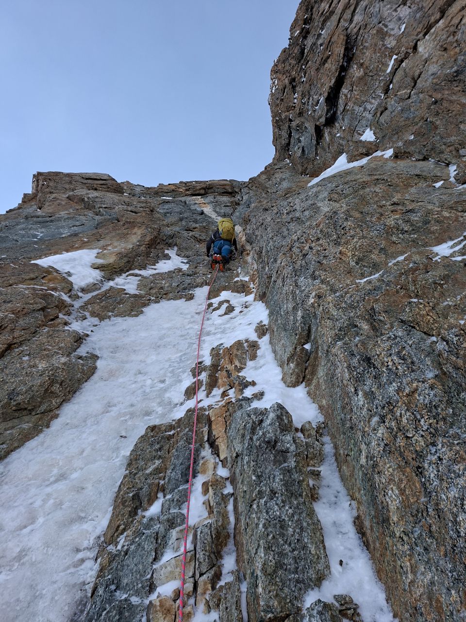 Ráno pokračujeme v ledových délkách na poslední ledové pole. Odtud vede zářez na pilíř, kde začínají délky v rozbité skále. Traverzujeme doprava do výlezu koutem, který je podle průvodce nejlepší variantou ukončení cesty. Jenže tady zas pro změnu není vůbec led. Takže opět traverz zpátky na pilíř. Po pár délkách ve skále se ocitáme v převislé skalní stěně. Zase špatně.