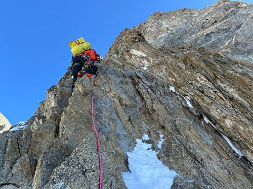 Ráno je všechno pod sněhem a po stopách ani památky. Viditelnost maximálně dvacet metrů. Slaňujeme a slézáme první pilíř směrem na jih do Itálie. Orientujeme se podle Mapy.com. Bez nich bychom se dolů asi nedostali. Traverz ledovce v nulové viditelnosti je taky bezva. Další pilíř se většinou slézá po pás ve sněhu, který každou chvíli ujíždí. Následuje pár slanění a zase za tmy stojíme na ledovci – skoro o polovinu materiálu lehčí.