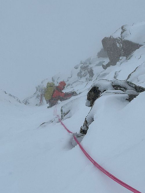 Jako tvrdý oříšek se ukazuje překonání odtrhové trhliny. Traverzujeme asi 100 metrů doprava, kde to vypadá schůdněji. Po pár pokusech o přelez trhliny sundávám batoh, s ním to fakt nepůjde. To nám to pěkně začíná. V převislé stěně z měkkého sněhu, která následuje vzápětí, se mi ruka s cepínem boří po rameno a sotva dýchám. Následuje další převis, tentokrát z tvrdého vodního ledu. Tam jdou naštěstí alespoň zavrtat šrouby. Pak se terén na chvíli zkulturní a my valíme jednu délku za druhou. Většinou jde o lezení v dost tvrdém ledu, ve kterém nám ale rychle ubývají síly.