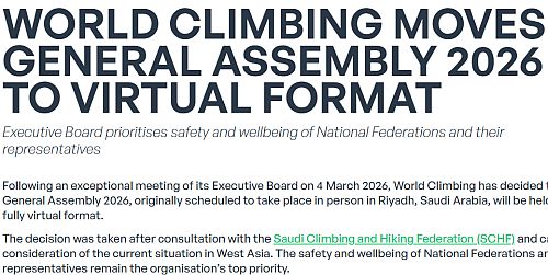 Mezinárodní federace sportovního lezení World Climbing (dříve IFSC) přesunula svou valnou hromadu pro rok 2026 do virtuálního formátu. Původně se měla uskutečnit fyzicky v Rijádu v Saúdské Arábii. Hlavním důvodem je aktuální situace v oblasti (kde válčí USA a Izrael s Íránem) a snaha upřednostnit bezpečnost zástupců národních federací, informovali včera představitelé World Climbing v tiskové zprávě, kt ... celý článek