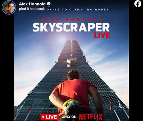 Americký lezec Alex Honnold dnes upřesnil termín svého dosud nejambicióznějšího urban-sola: Na taiwanský mrakodrap Taipei 101 poleze bez jištění v sobotu 24. ledna 2026 od 09:00 dopoledne taiwanského času (pátek 23. ledna 2026 amerického nebo středoevropského času). Celý výstup má v přímém přenosu vysílat streamovací platforma Netflix. ... celý článek